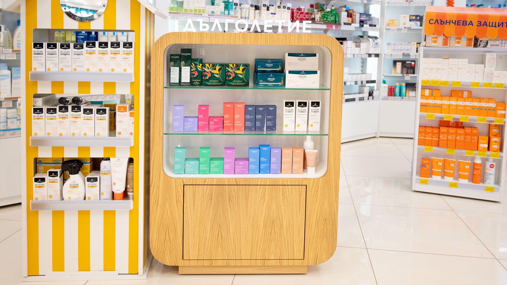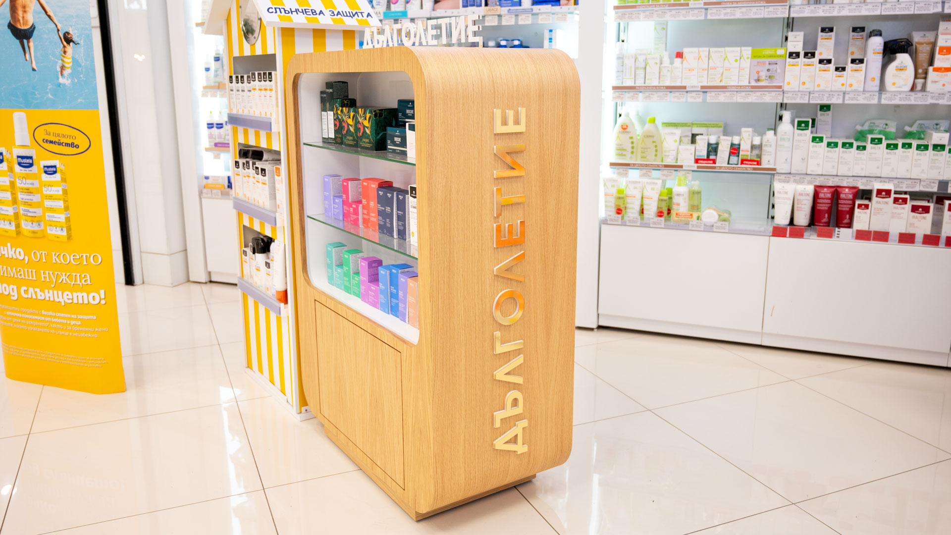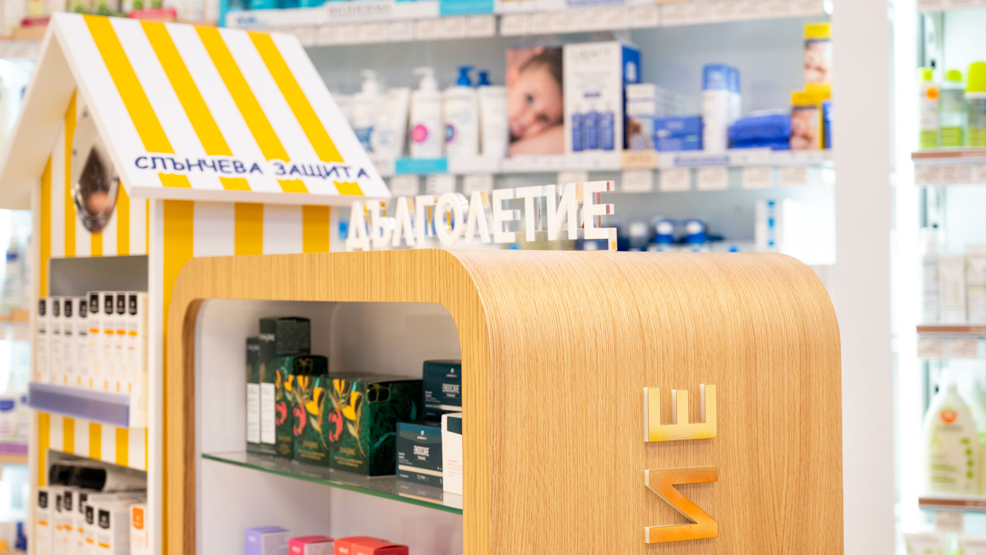 Проект по изработка на продуктови дисплеи „Дълголетие“ за Аптеки SUBRA. Реализирахме ги по предварителна концепция – с конструкция от фурнирован MDF, рафтово разпределение от стъкло и надписи от плексиглас, апликирани със златно фолио.