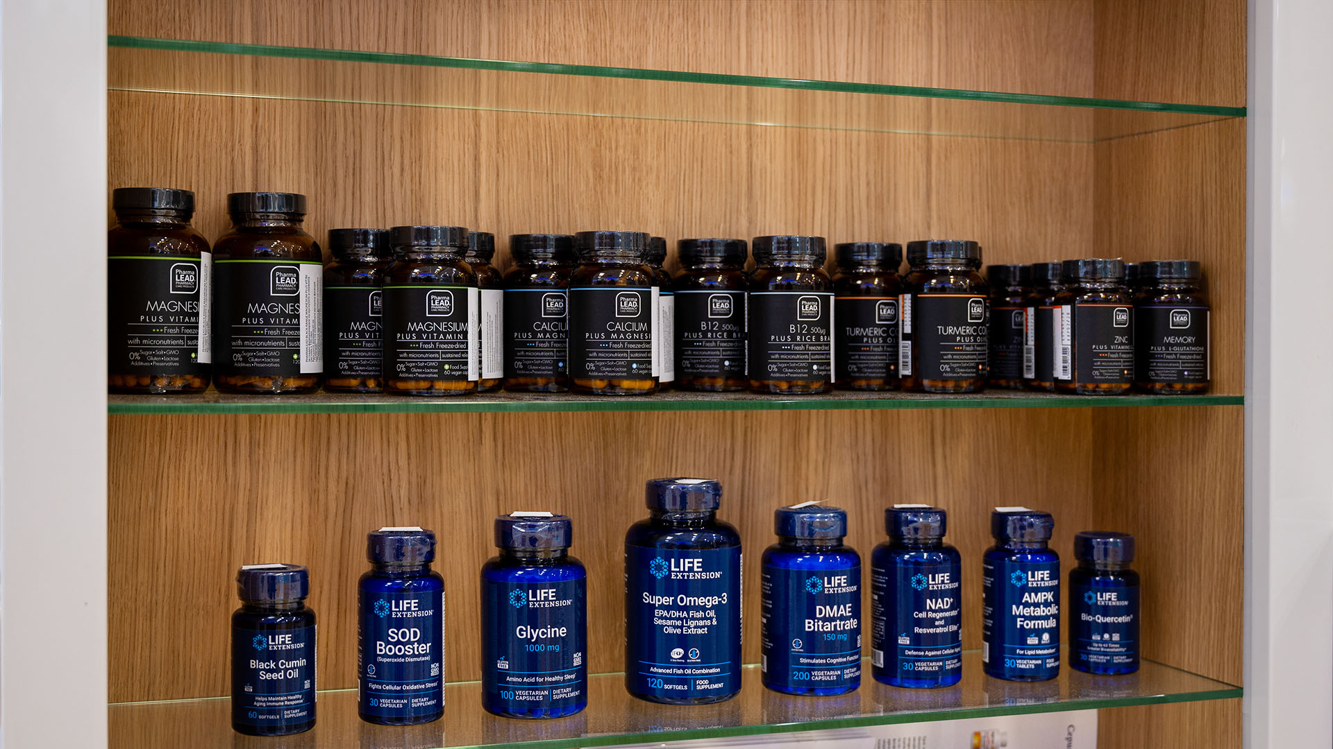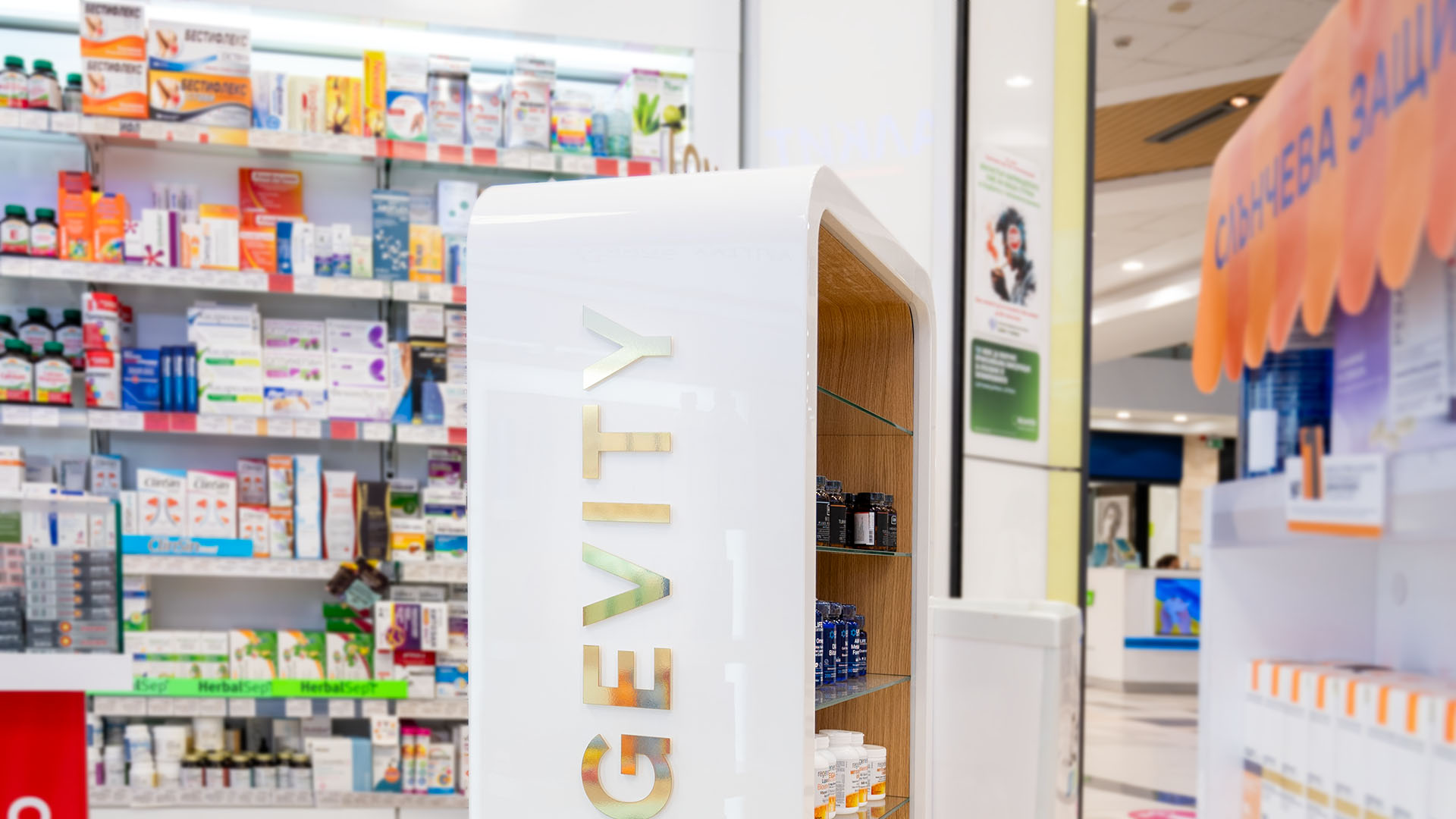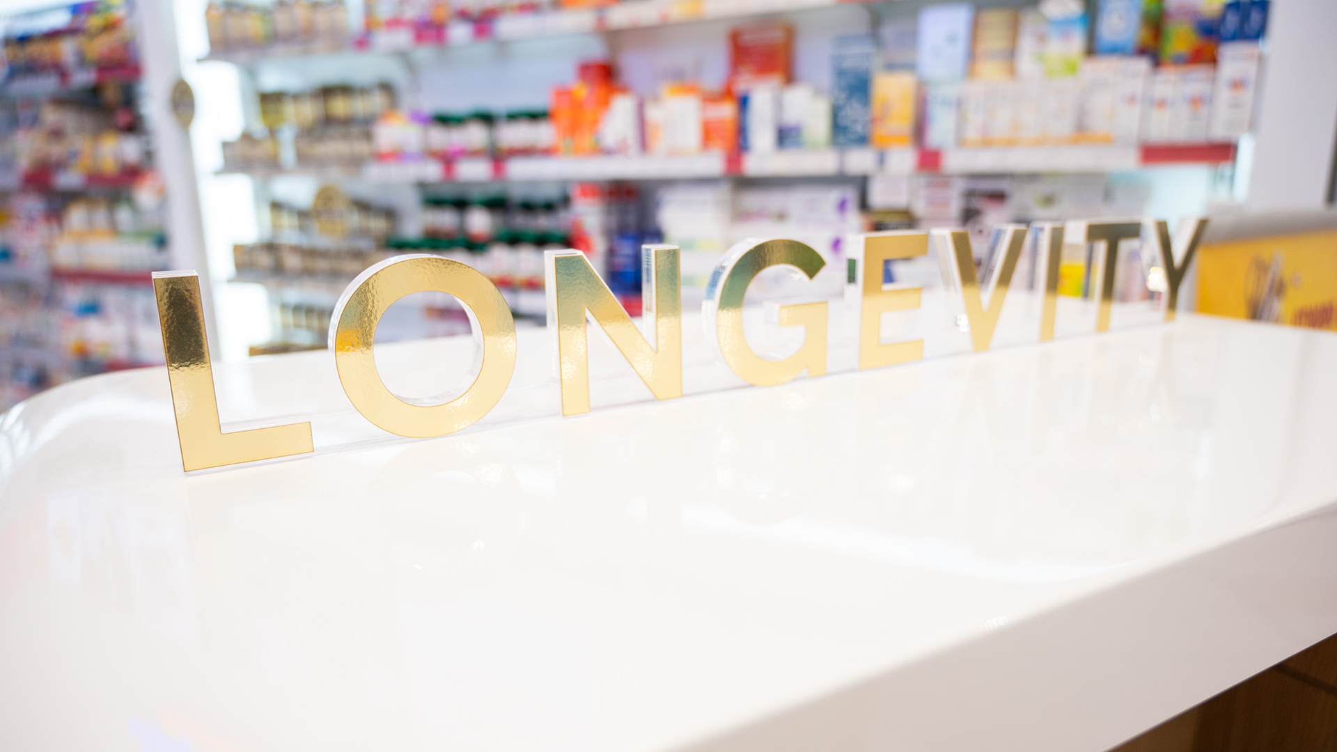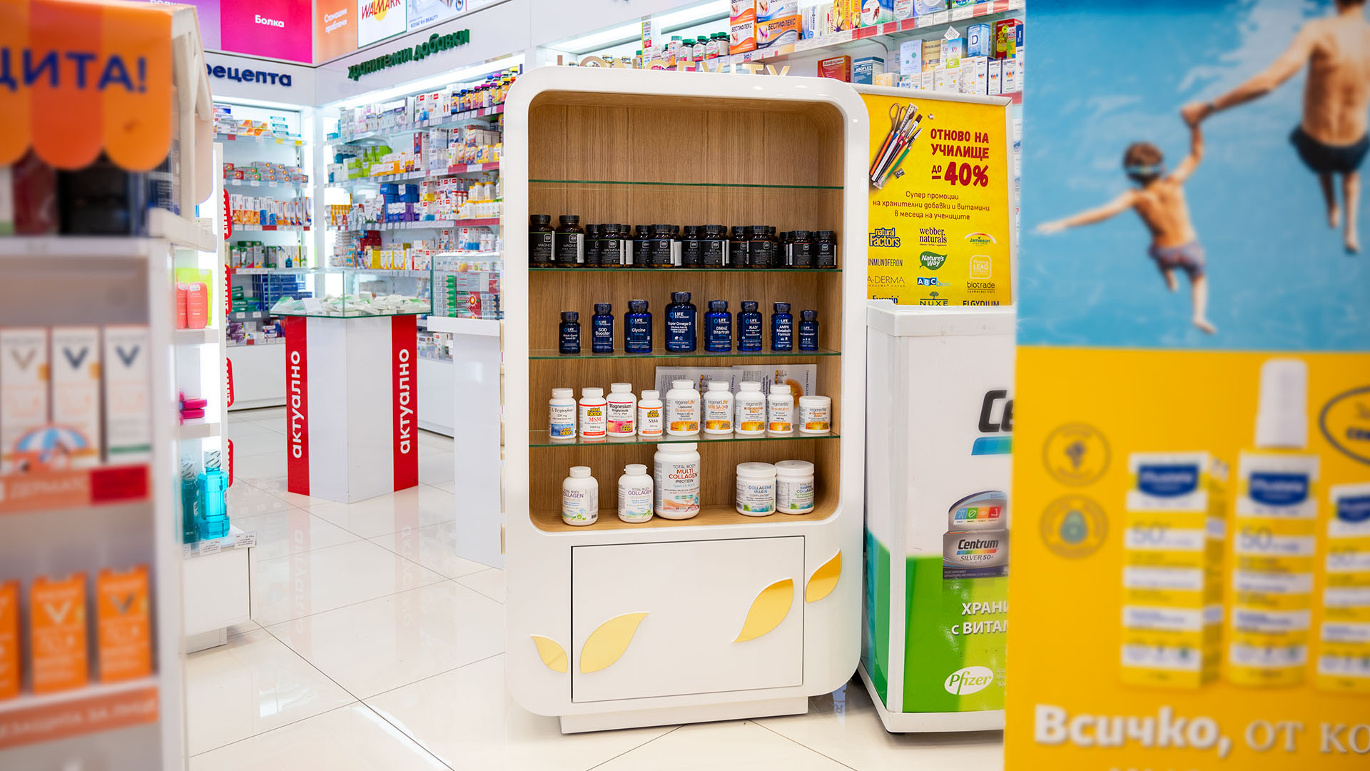 Проект по изработка на продуктови дисплеи „Дълголетие“ за Аптеки SUBRA. Реализирахме ги по предварителна концепция – с конструкция от фурнирован MDF, рафтово разпределение от стъкло и надписи от плексиглас, апликирани със златно фолио.